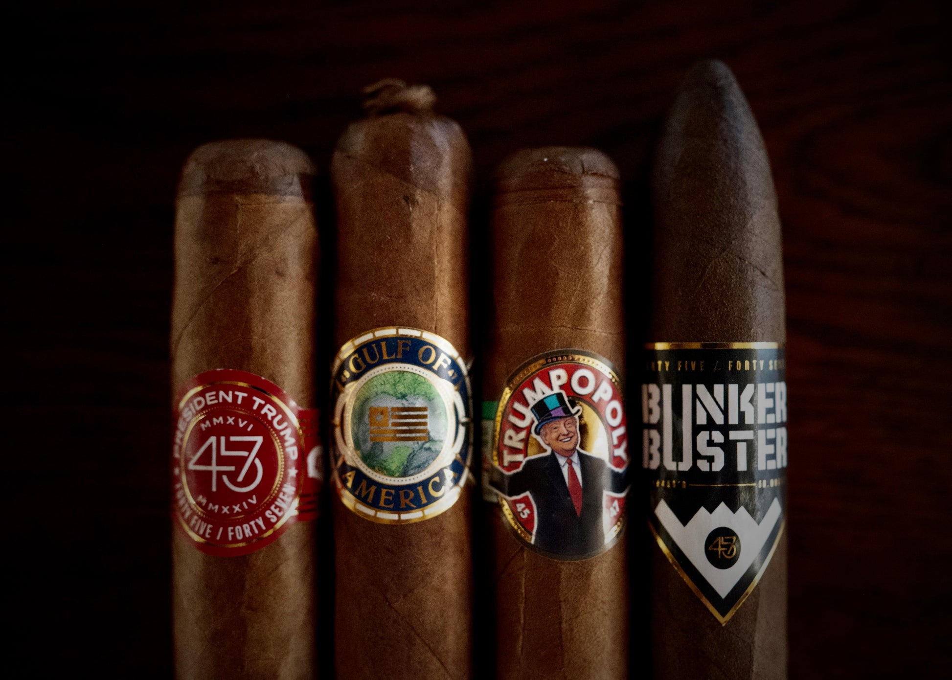 The Collection Sampler 4 Pack includes: (1) 45/47 Cigar, (1) Gulf of America Cigar, (1) Trumpopoly Cigar, (1) Bunker Buster Cigar